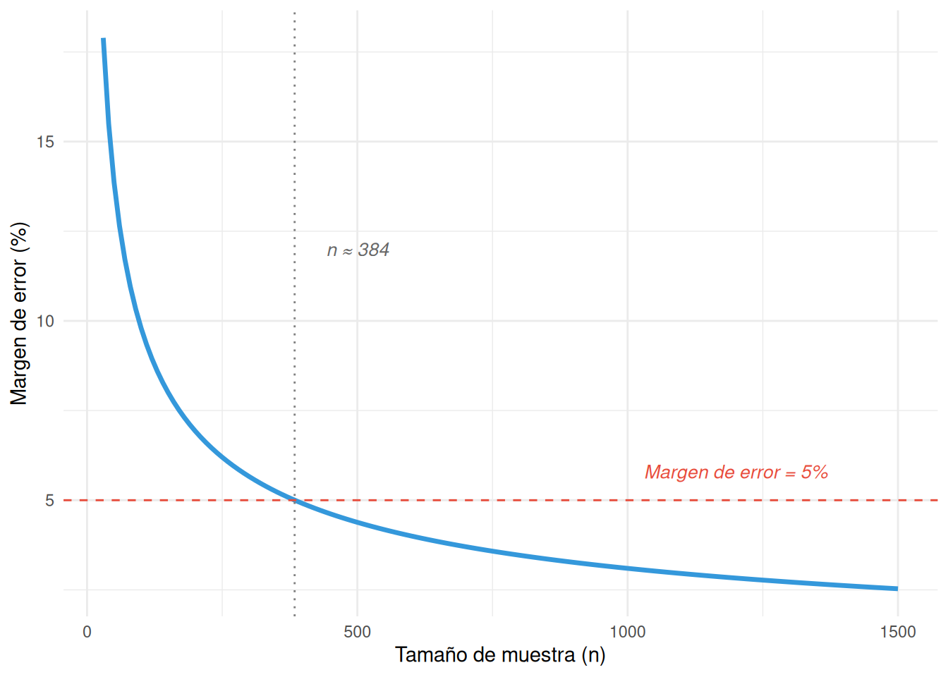 Nota cómo a partir de cierto punto, aumentar la muestra tiene rendimientos decrecientes. Pasar de 100 a 400 casos reduce enormemente el margen de error. Pero pasar de 400 a 1.000 apenas lo mejora. Es la ley de rendimientos decrecientes aplicada al muestreo.